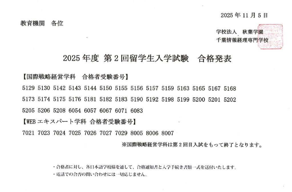 2025年11月5日 / 最終更新日時 : 2025年11月5日 akibagakuen おしらせ 2025年10月25日(土)実施 第2回留学生入学試験合格発表につきまして 2025年10月25日(土)実施の 第2回留学生入学試験合格発表につきまして、以下の通り掲示させていただきます。 国際戦略経営学科の募集は、第2回入学試験をもって終了いたしました。多くのご出願をいただきましてありがとうございました。